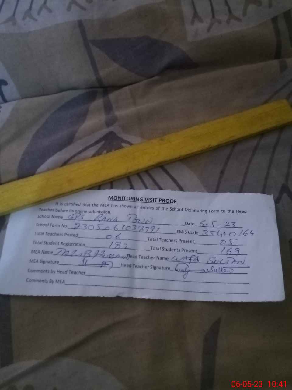 | Attendance Register | Head Teacher | MEA with School | Visit Proof |