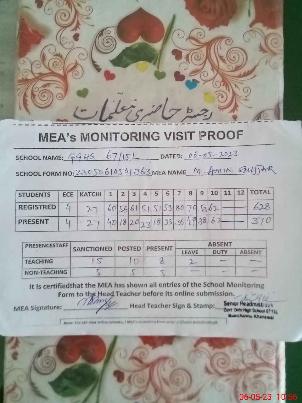 | Attendance Register | Head Teacher | MEA with School | Visit Proof |