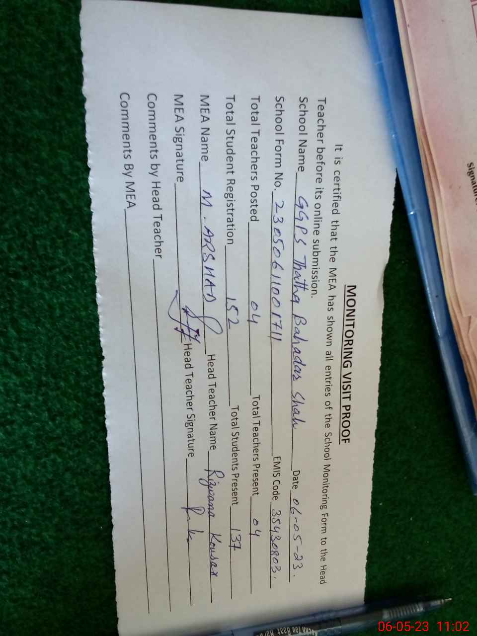 | Attendance Register | Head Teacher | MEA with School | Visit Proof |