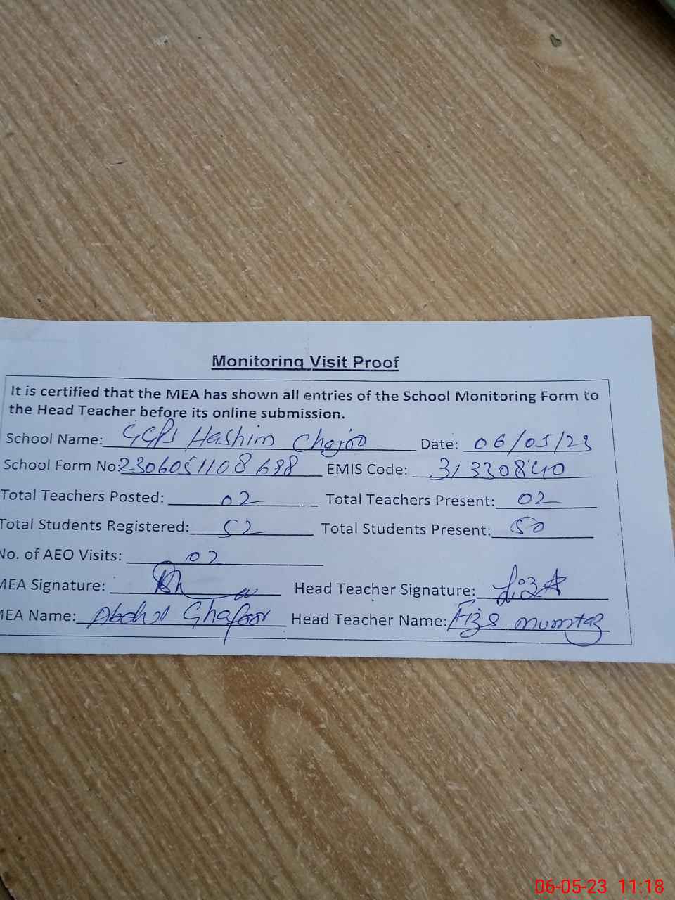 | Attendance Register | Head Teacher | MEA with School | Visit Proof |