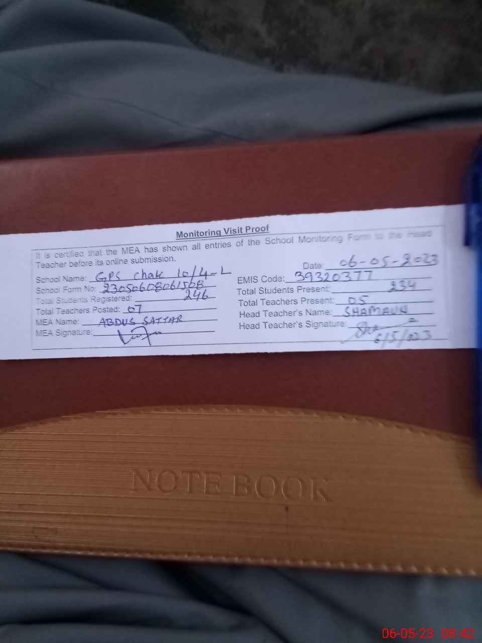 | Attendance Register | Head Teacher | MEA with School | Visit Proof |