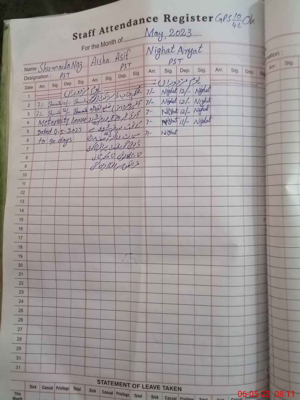| 35**** | Sh**** Na**** | PST | Regular | 1 | 0 | 0 | 0 | 0 | 0 | 0 | 0 | 1 | Maternity |