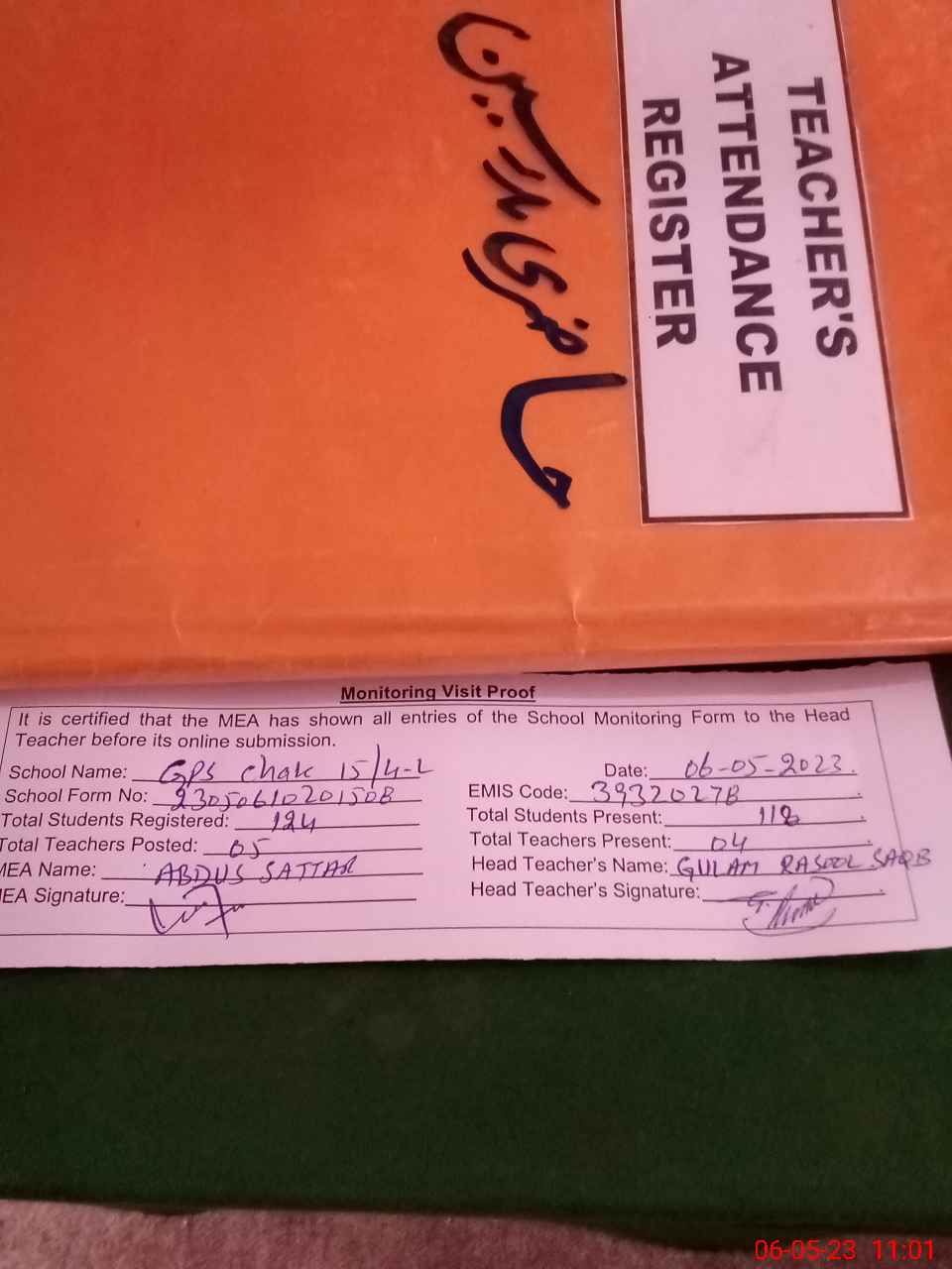 | Attendance Register | Head Teacher | MEA with School | Visit Proof |