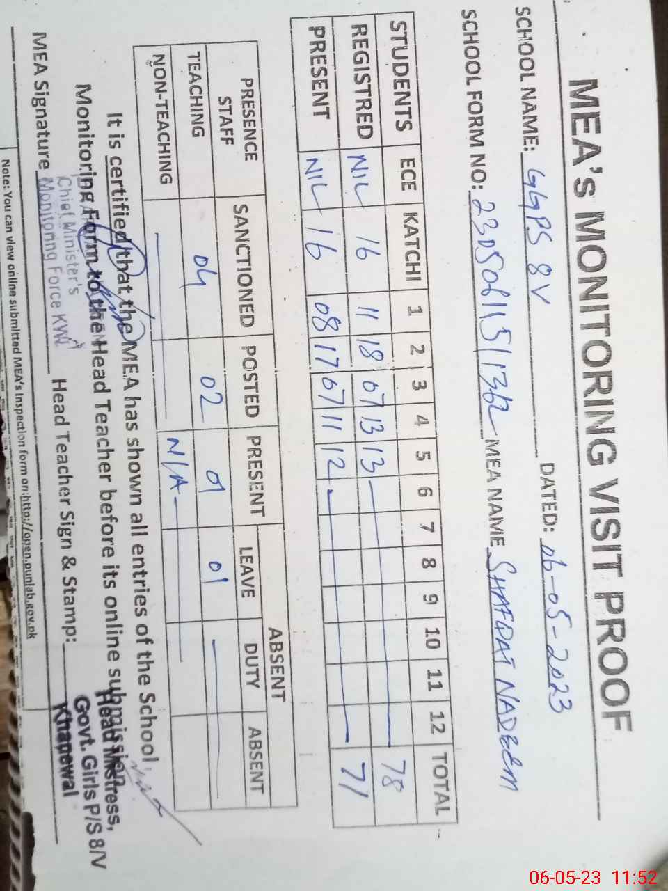 | Attendance Register | Head Teacher | MEA with School | Visit Proof |
