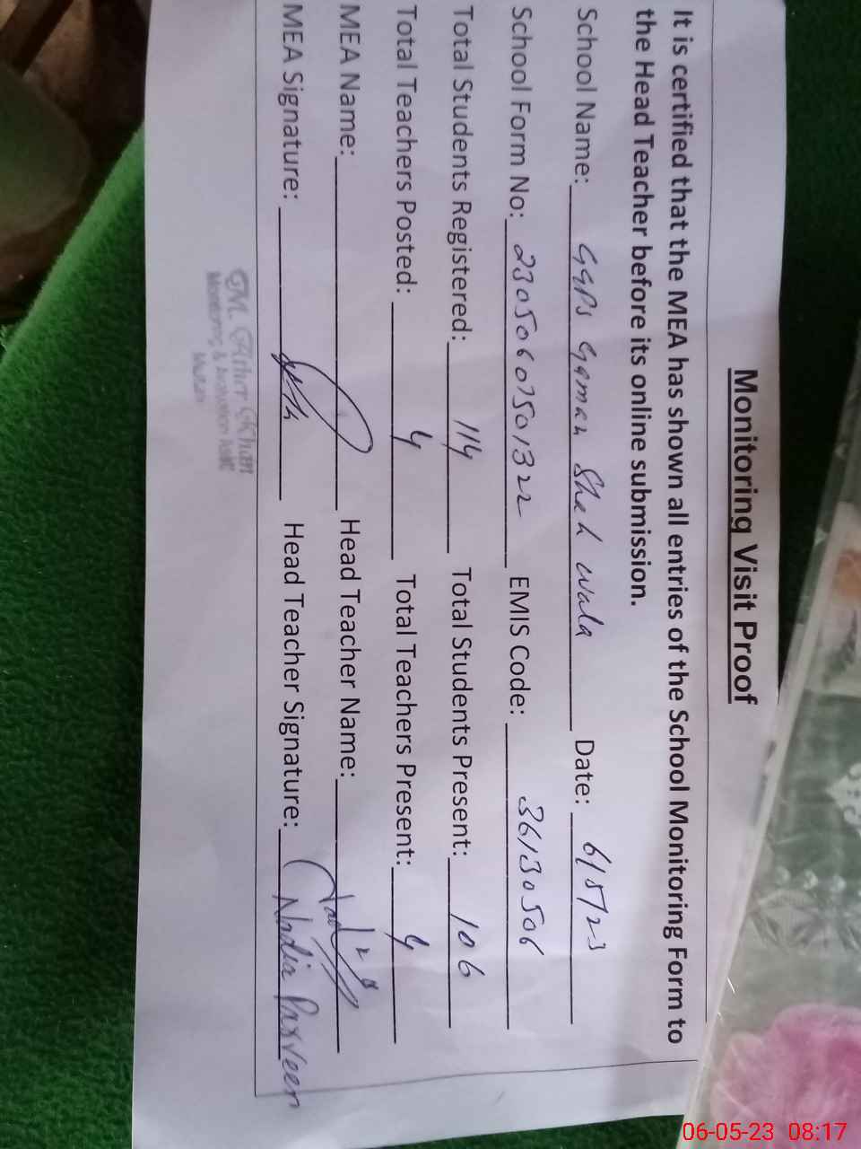| Attendance Register | Head Teacher | MEA with School | Visit Proof |
