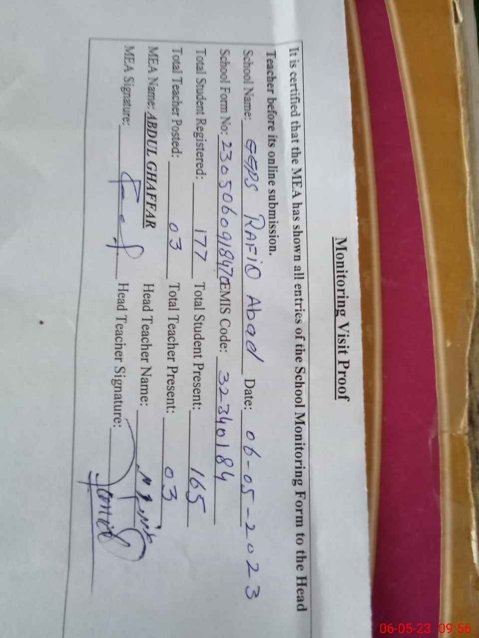 | Attendance Register | Head Teacher | MEA with School | Visit Proof |