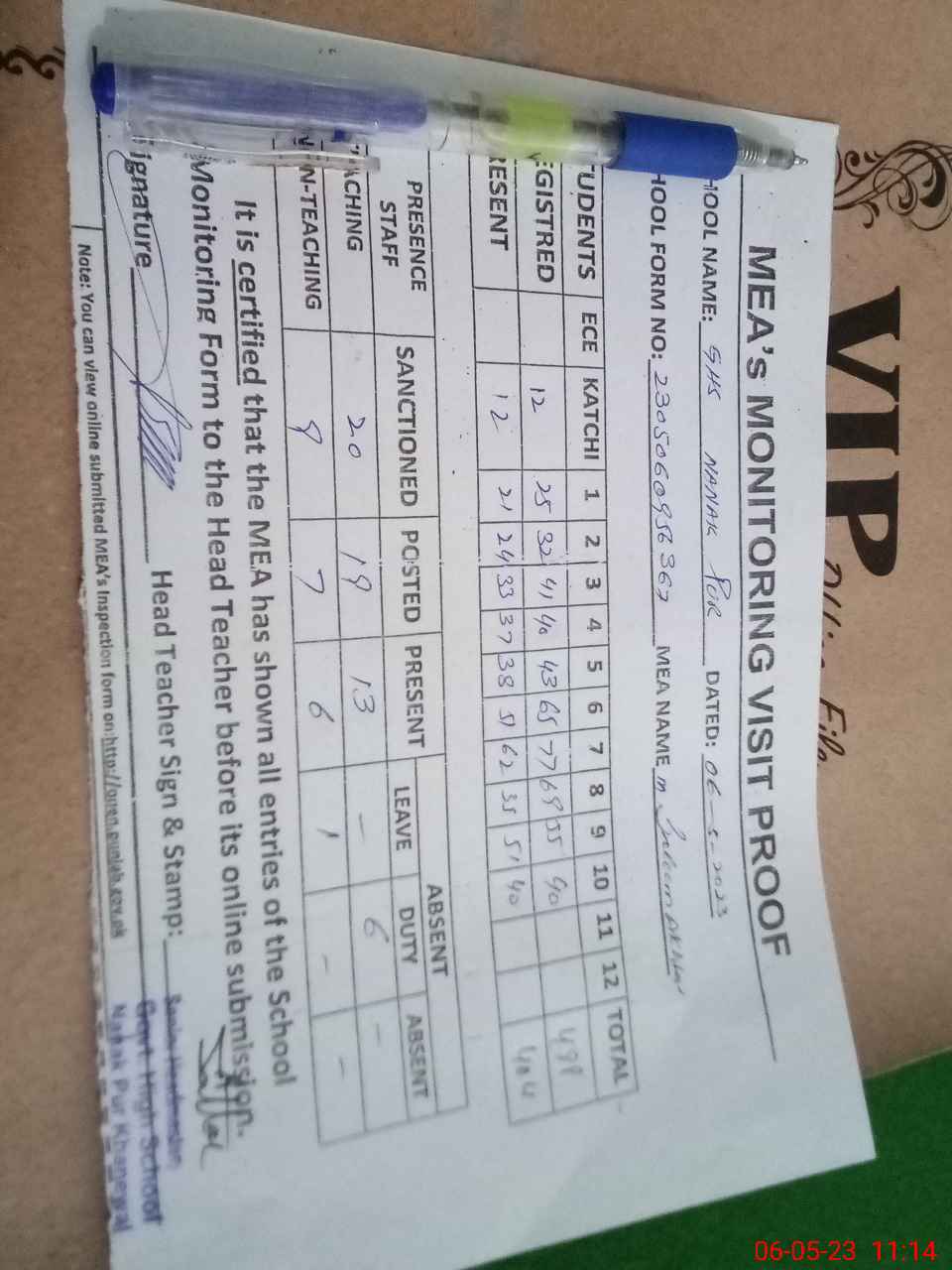 | Attendance Register | Head Teacher | MEA with School | Visit Proof |