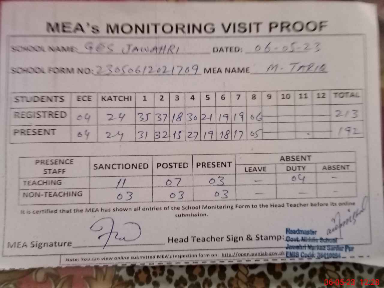 | Attendance Register | Head Teacher | MEA with School | Visit Proof |
