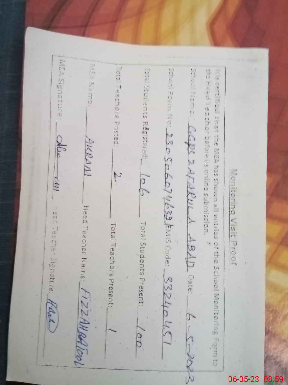 | Certified that this School was Inspected by the Undersigned MEA/DMO Today and the Information Stated Above is as Per Record. | |||||
