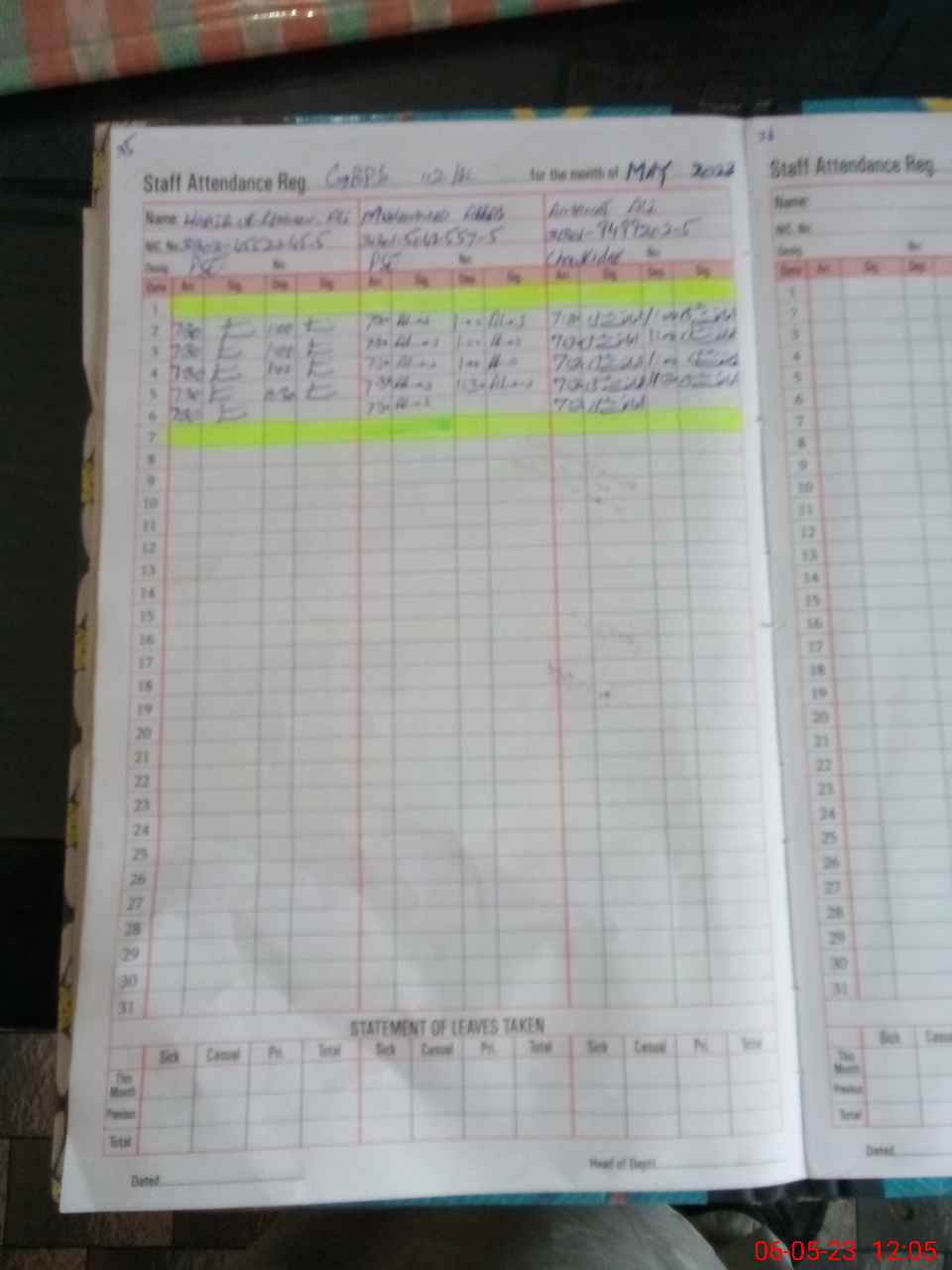 | CNIC | Full Name | Designation | R/C | Absence During Last Calender Month |