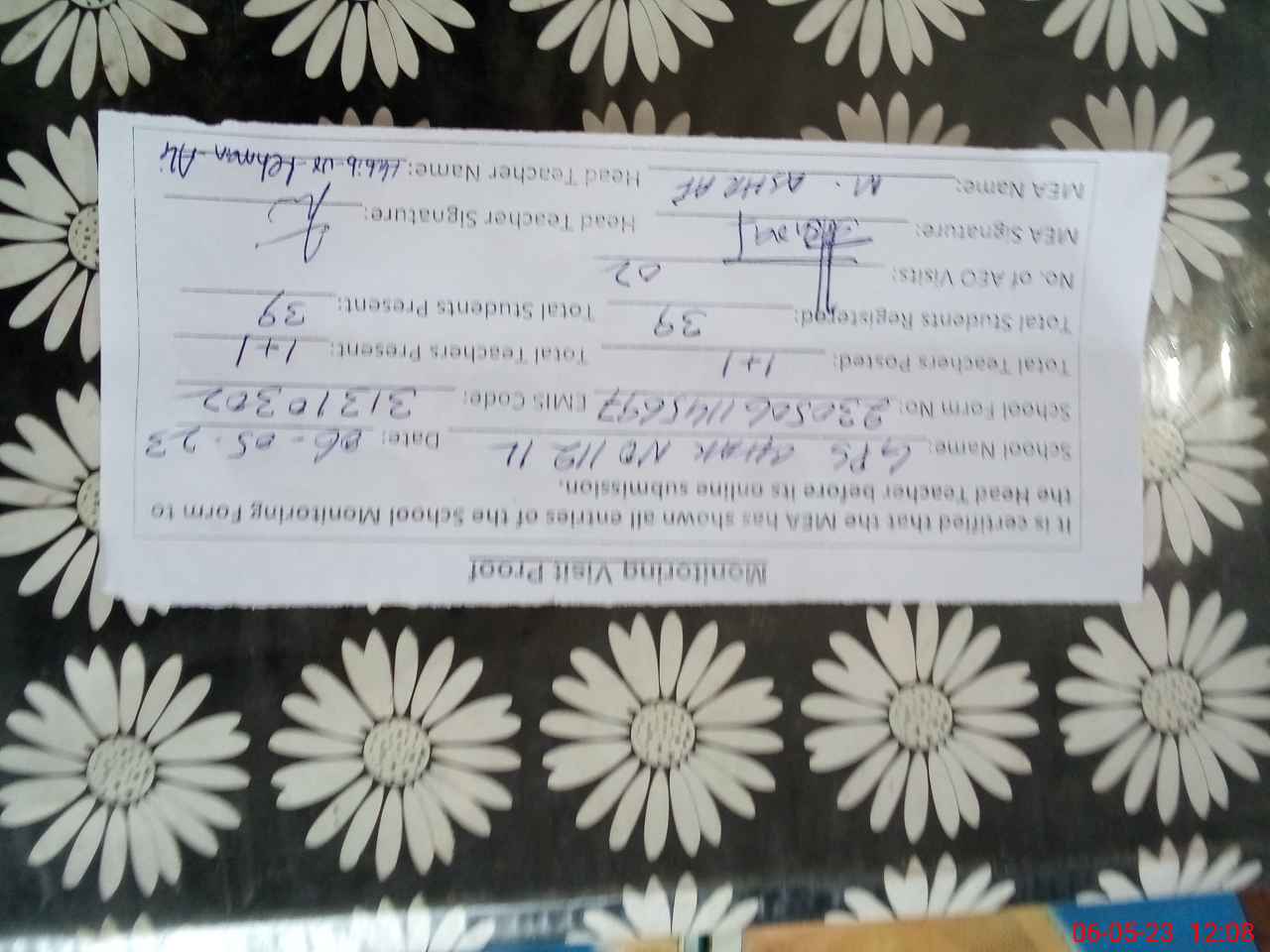 | Attendance Register | Head Teacher | MEA with School | Visit Proof |