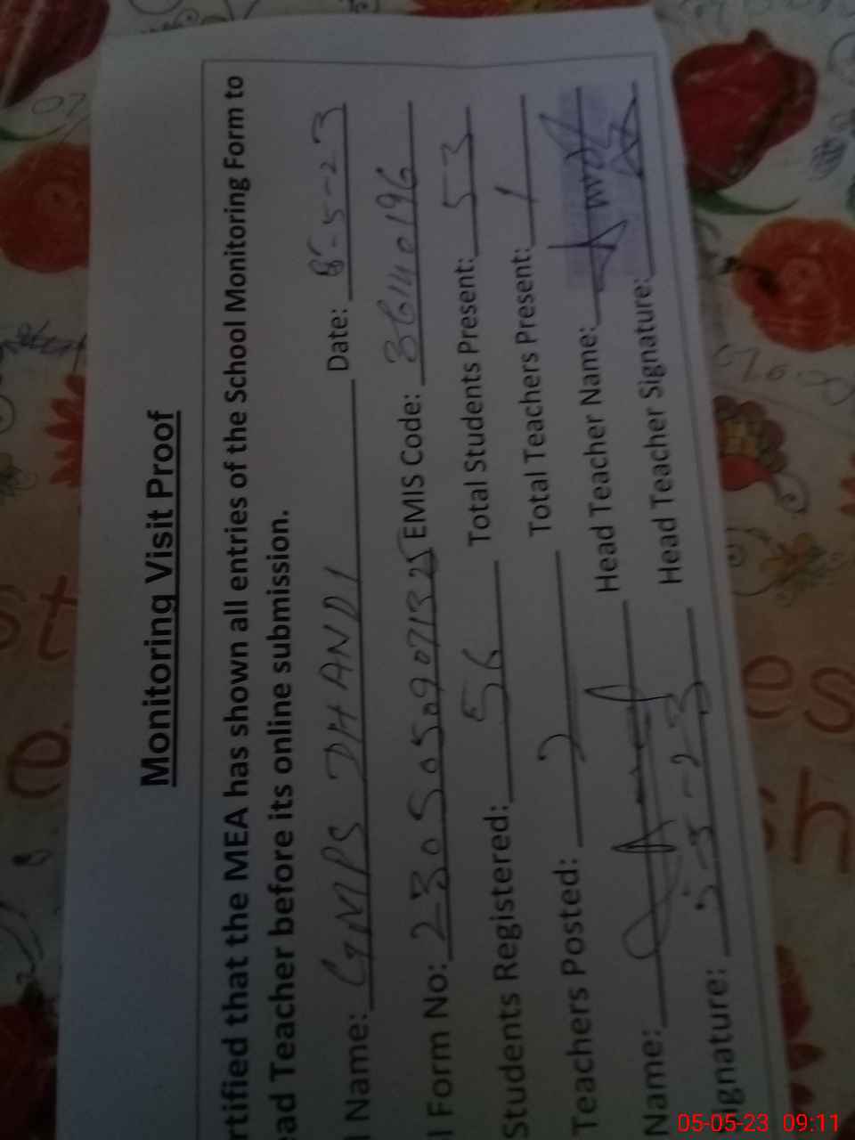 | Attendance Register | Head Teacher | MEA with School | Visit Proof |