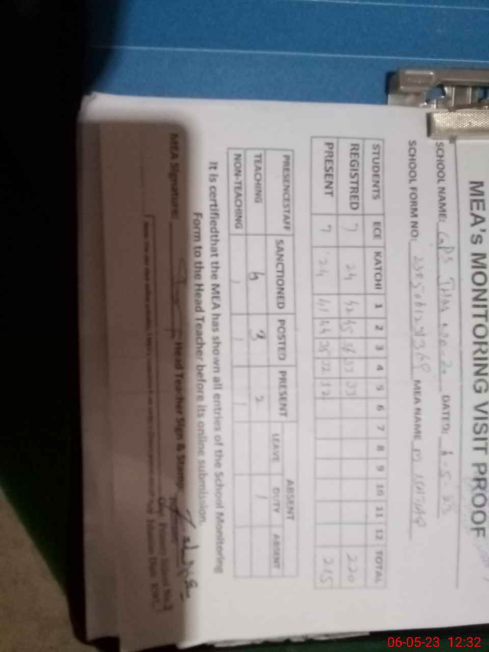 | Attendance Register | Head Teacher | MEA with School | Visit Proof |