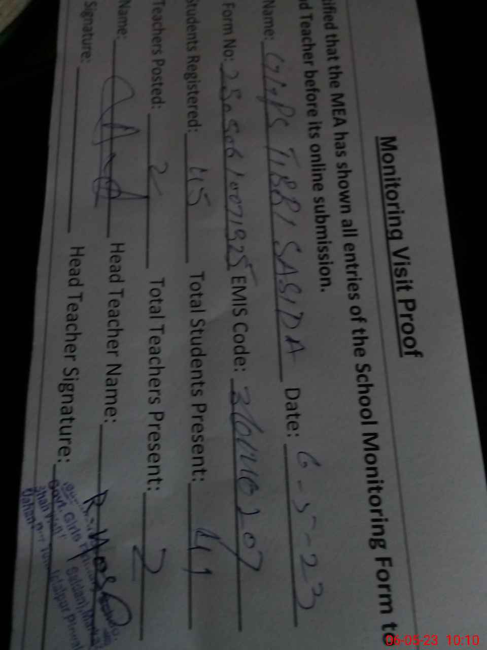 | Attendance Register | Head Teacher | MEA with School | Visit Proof |