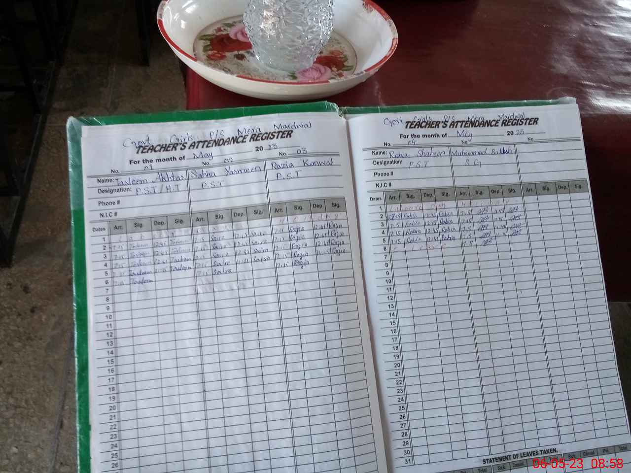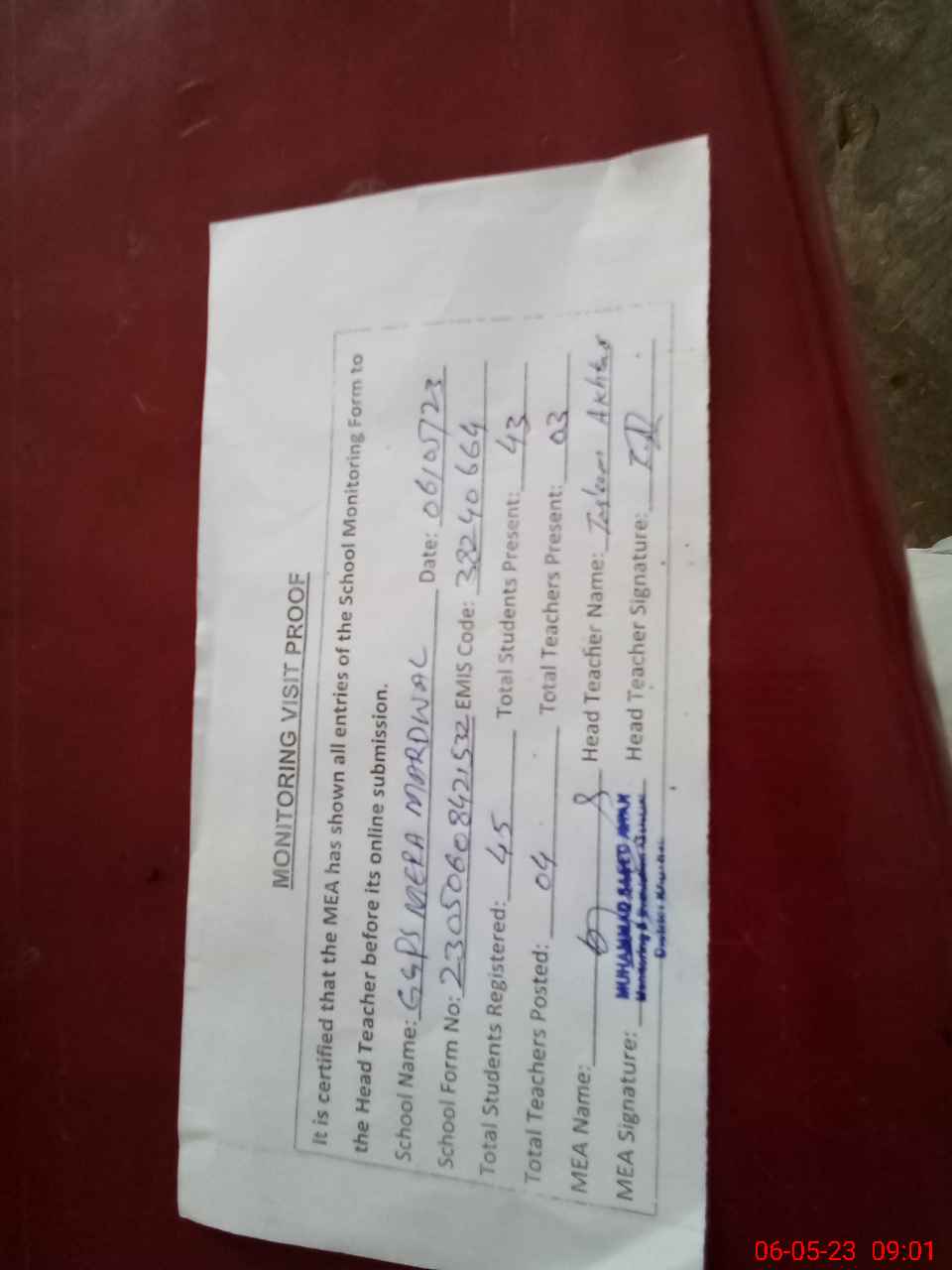 | Attendance Register | Head Teacher | MEA with School | Visit Proof |
