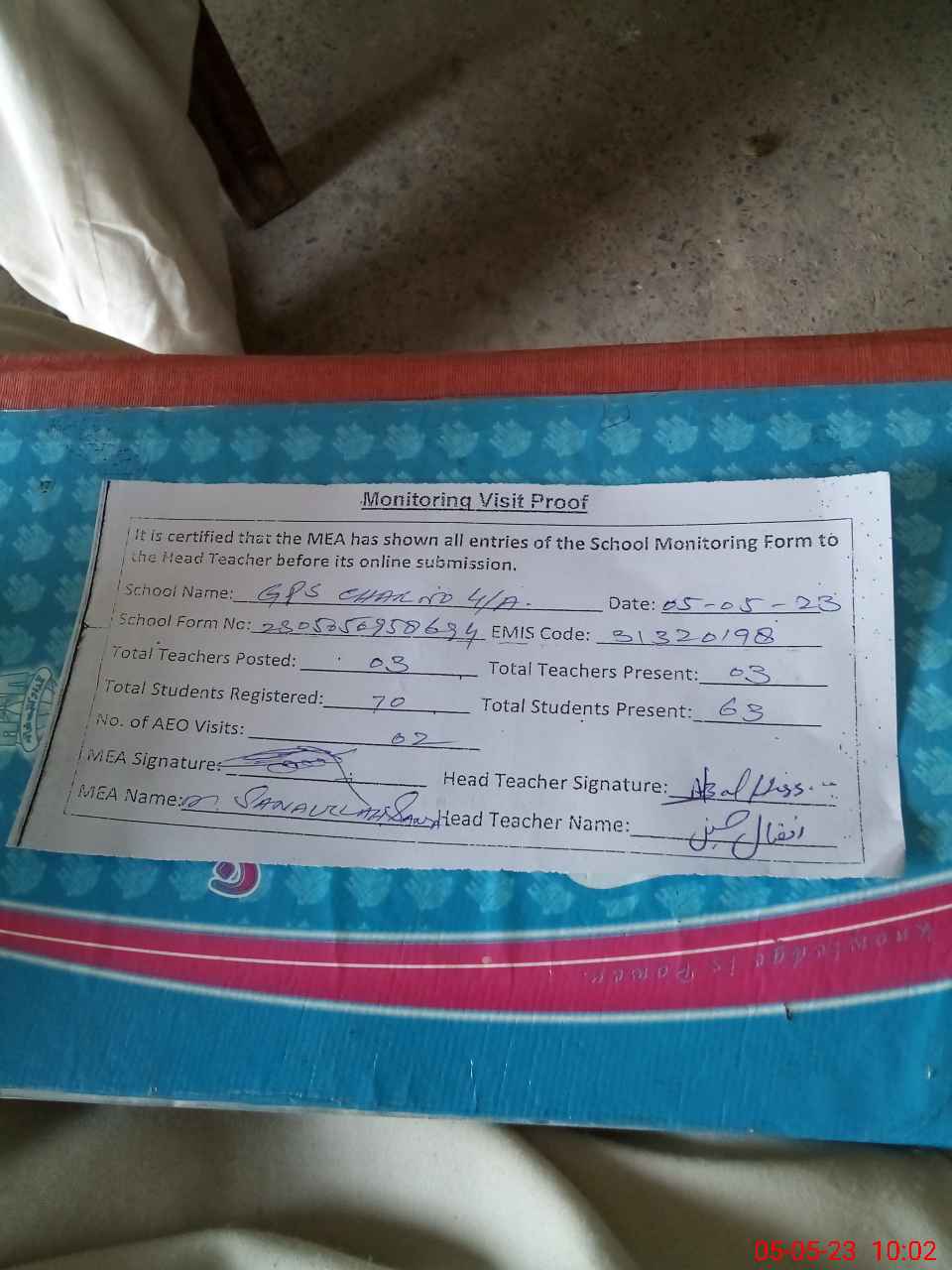 | Attendance Register | Head Teacher | MEA with School | Visit Proof |