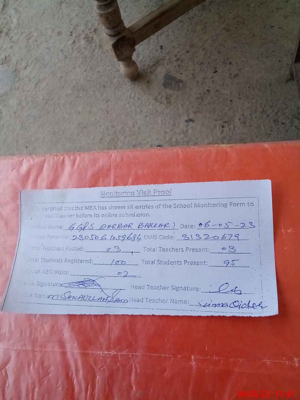 | Attendance Register | Head Teacher | MEA with School | Visit Proof |