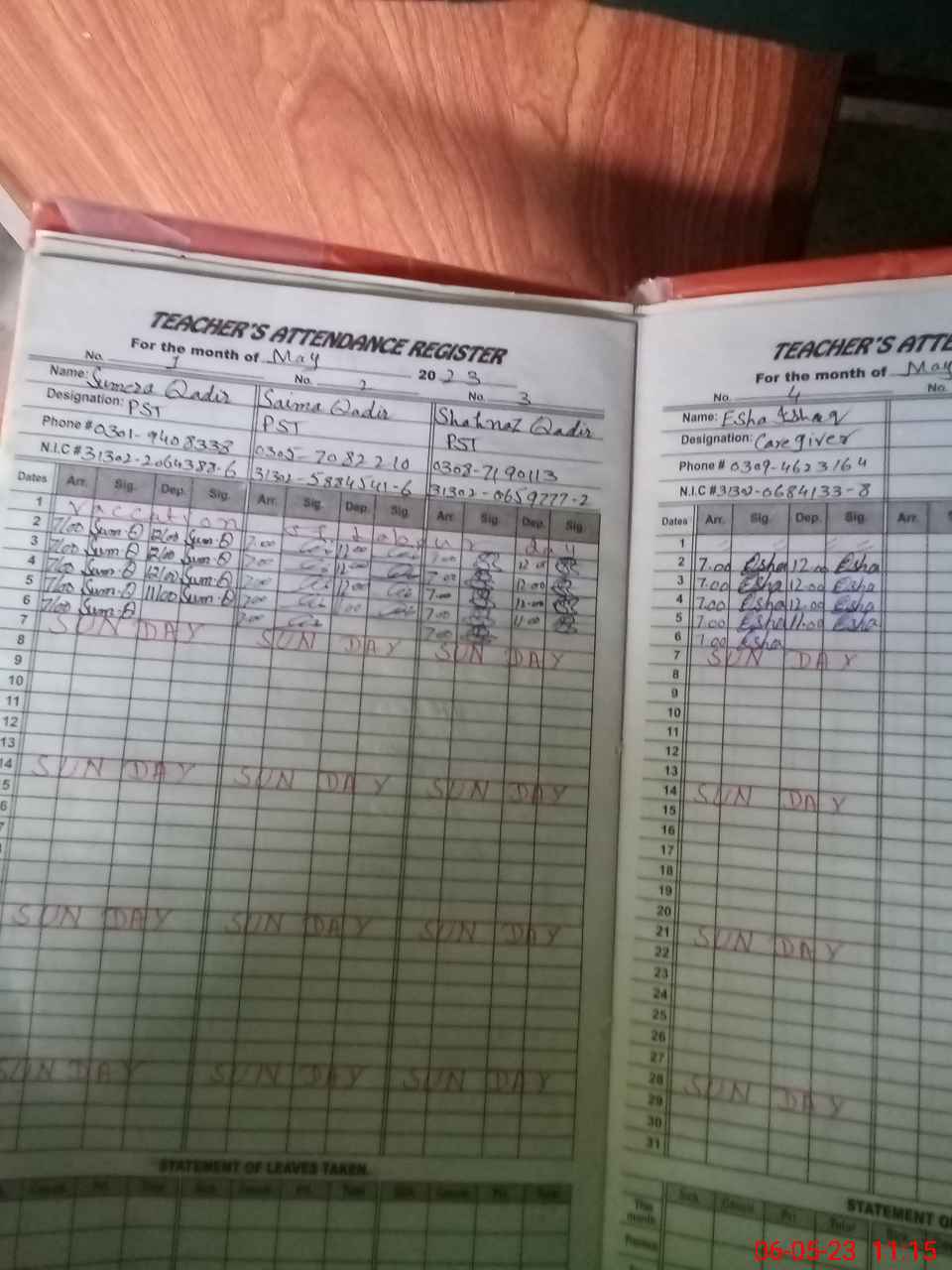 | CNIC | Full Name | Designation | R/C | Absence During Last Calender Month |
