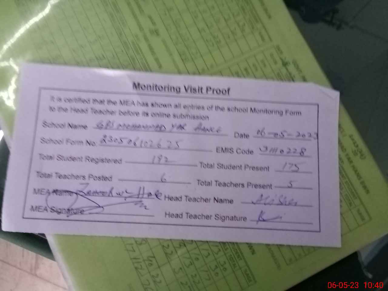 | Attendance Register | Head Teacher | MEA with School | Visit Proof |