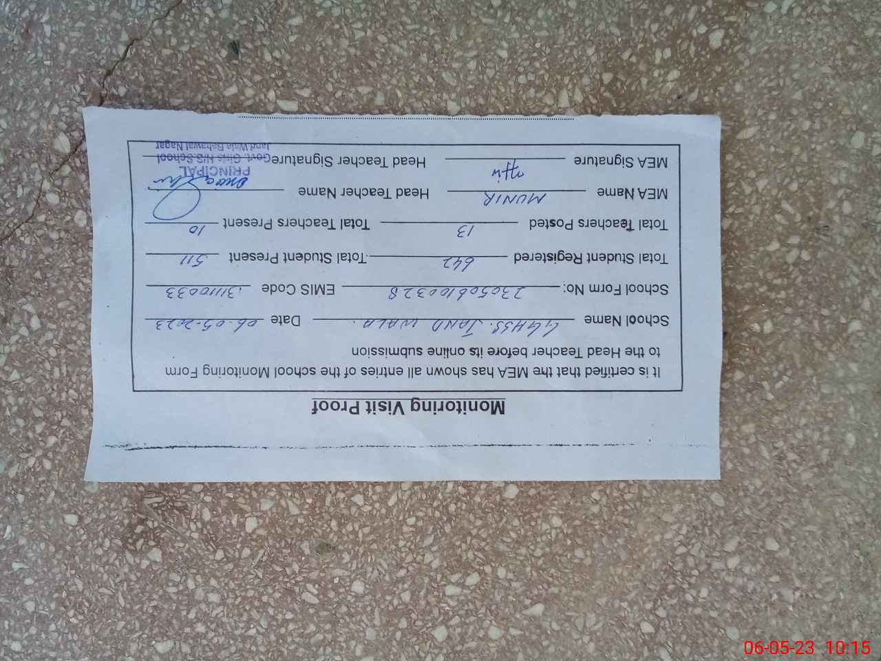 | Certified that this School was Inspected by the Undersigned MEA/DMO Today and the Information Stated Above is as Per Record. | |||||