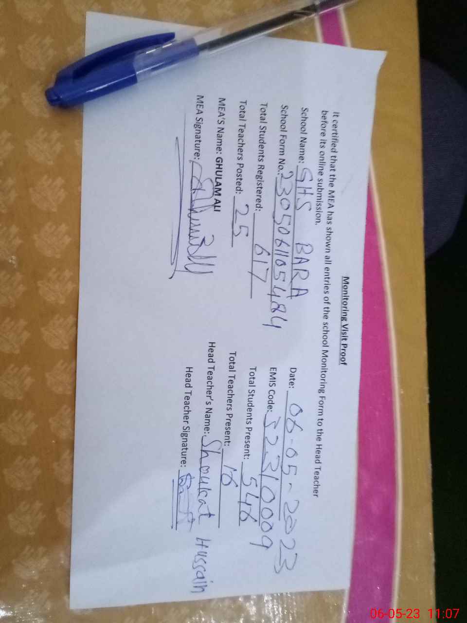 | Attendance Register | Head Teacher | MEA with School | Visit Proof |