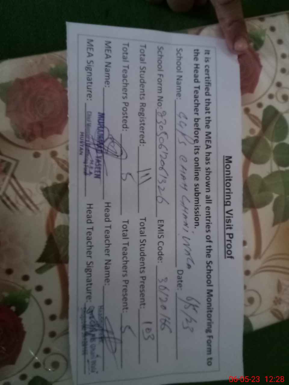 | Attendance Register | Head Teacher | MEA with School | Visit Proof |
