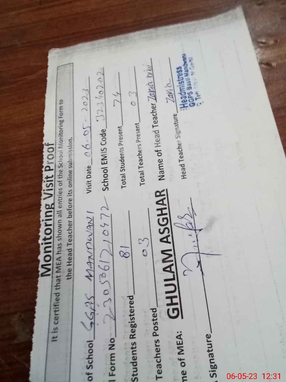 | Attendance Register | Head Teacher | MEA with School | Visit Proof |