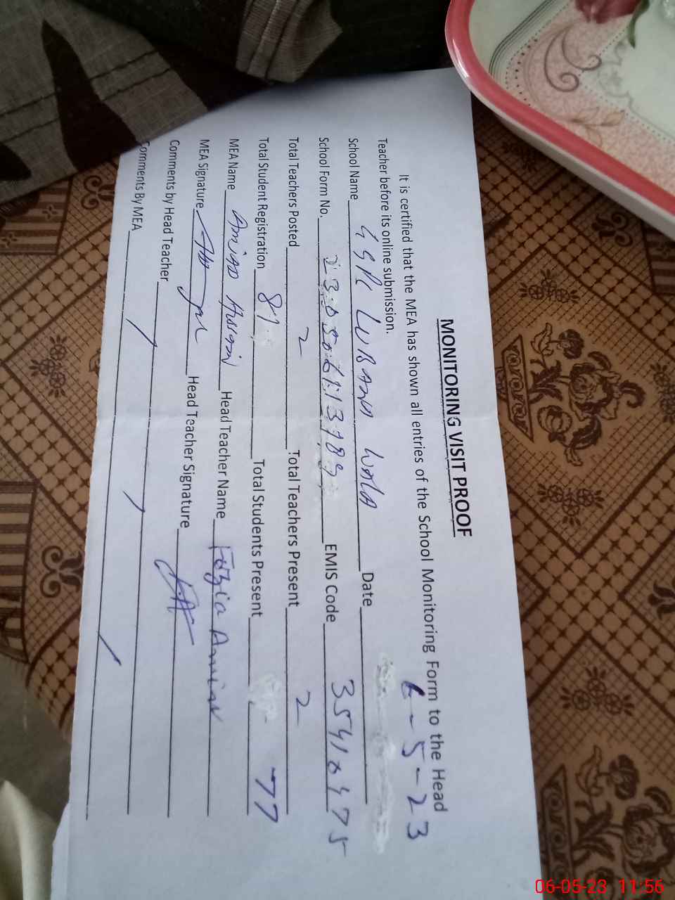 | Attendance Register | Head Teacher | MEA with School | Visit Proof |