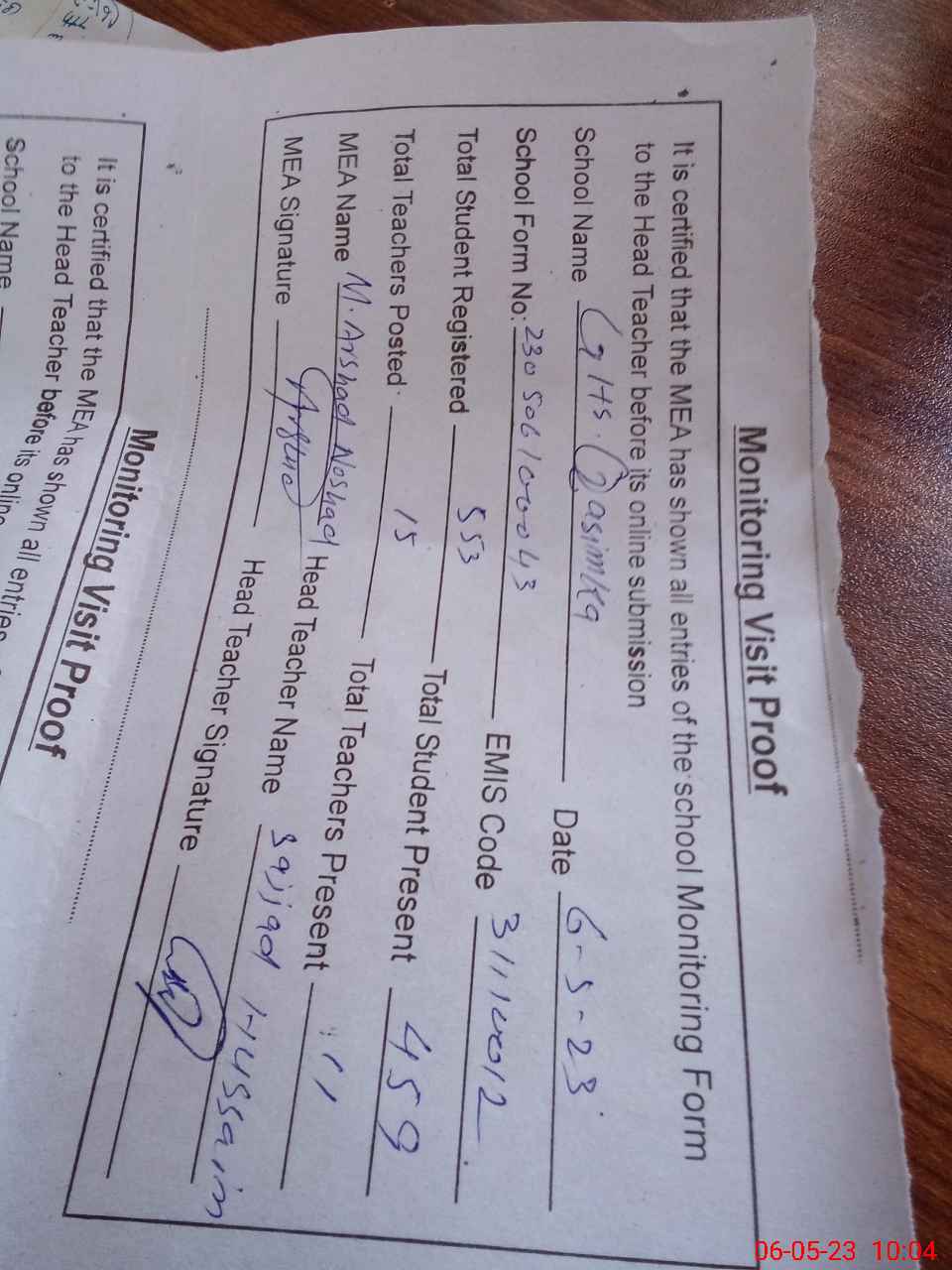 | Attendance Register | Head Teacher | MEA with School | Visit Proof |