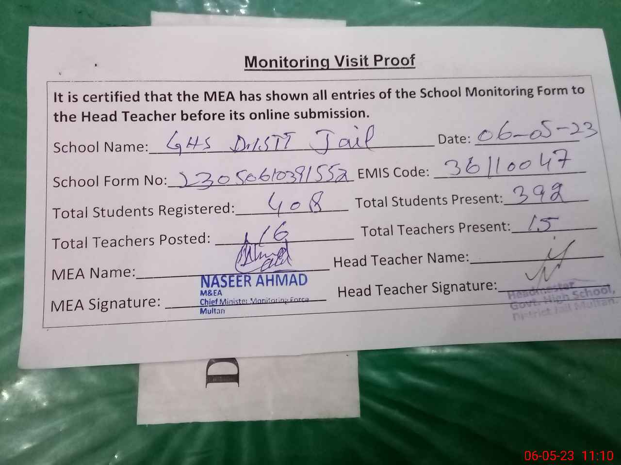 | Monitoring Date: 06-05-2023 | Start Time: 06-05-2023 10:39 AM | End Time: 06-05-2023 11:15 AM | Name of MEA: Na**** Ah**** | |