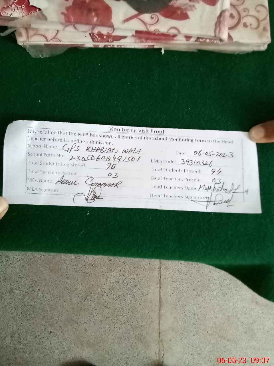| Attendance Register | Head Teacher | MEA with School | Visit Proof |