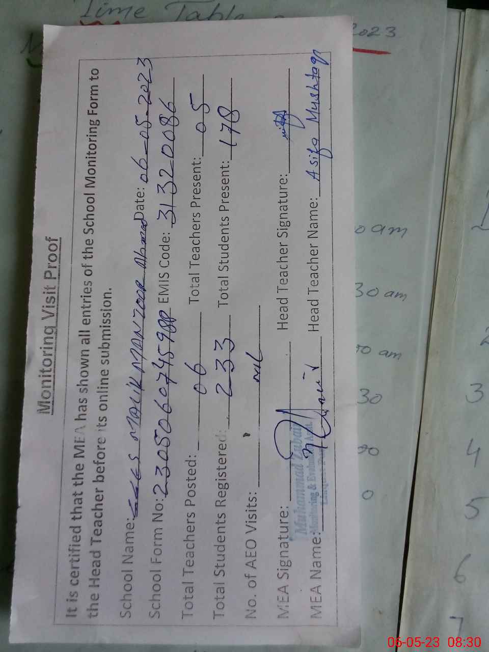 | Attendance Register | Head Teacher | MEA with School | Visit Proof |