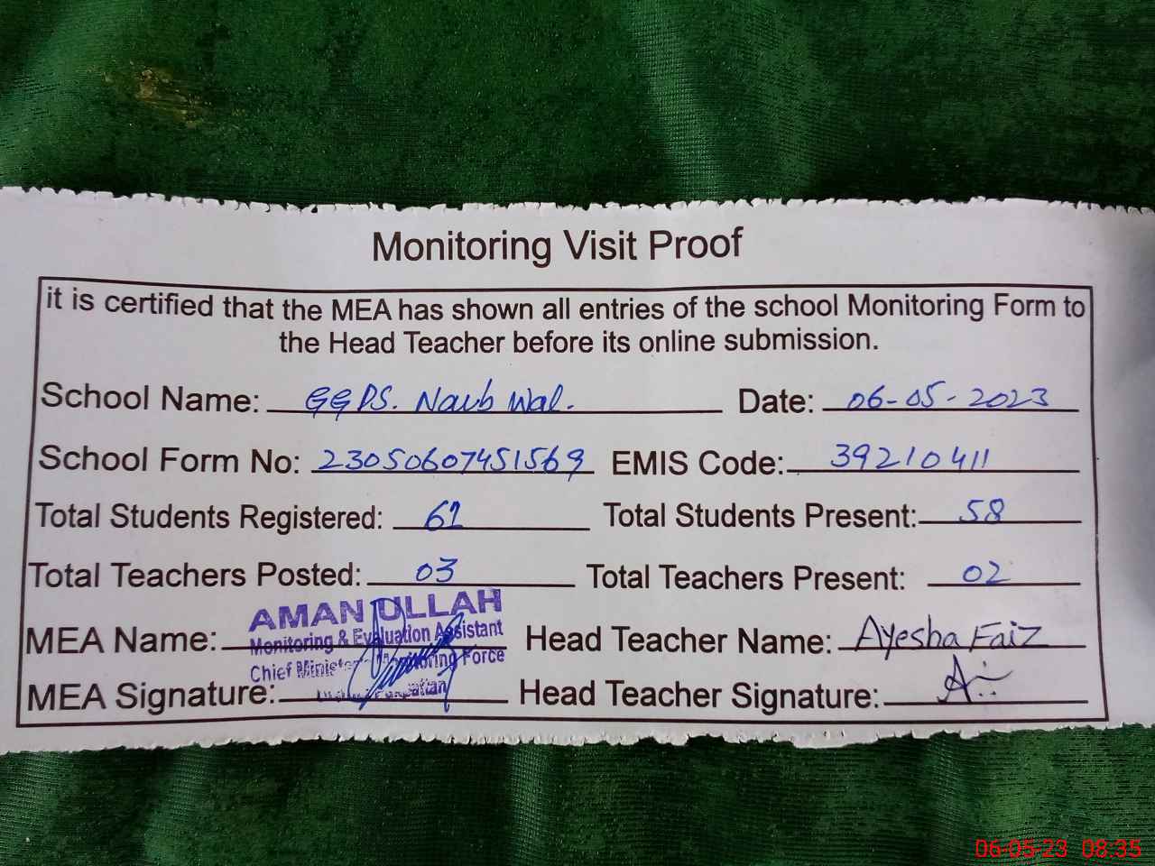 | Attendance Register | Head Teacher | MEA with School | Visit Proof |