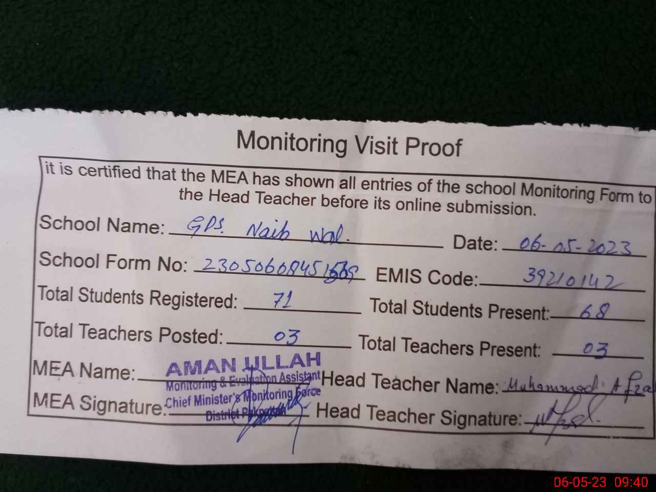 | Attendance Register | Head Teacher | MEA with School | Visit Proof |