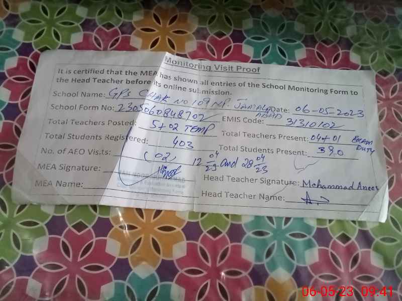 | EMIS Code: 31310102 | Name of School: GPS CHAK 109/NP JAMAL ABAD | |||