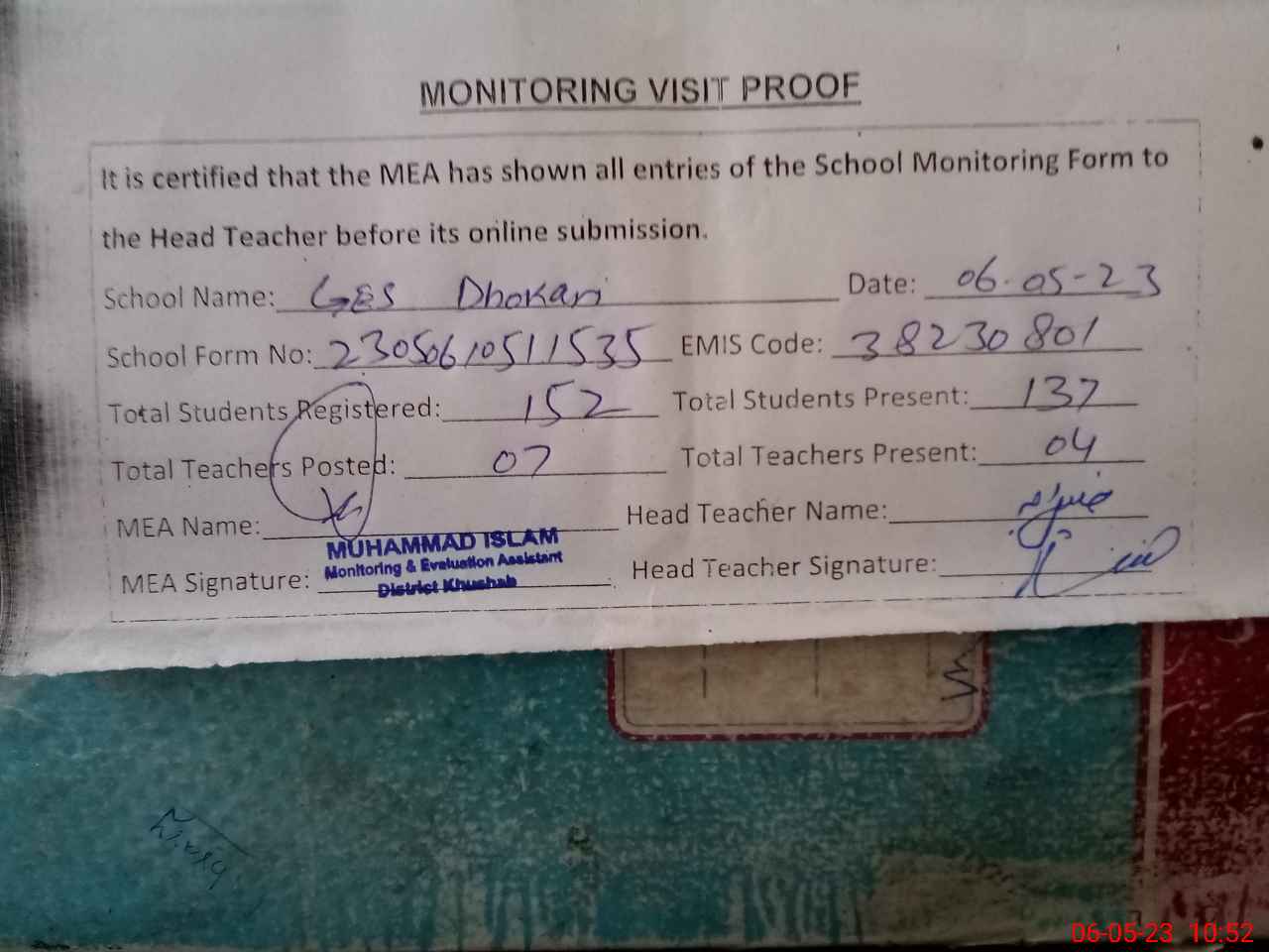 | Attendance Register | Head Teacher | MEA with School | Visit Proof |