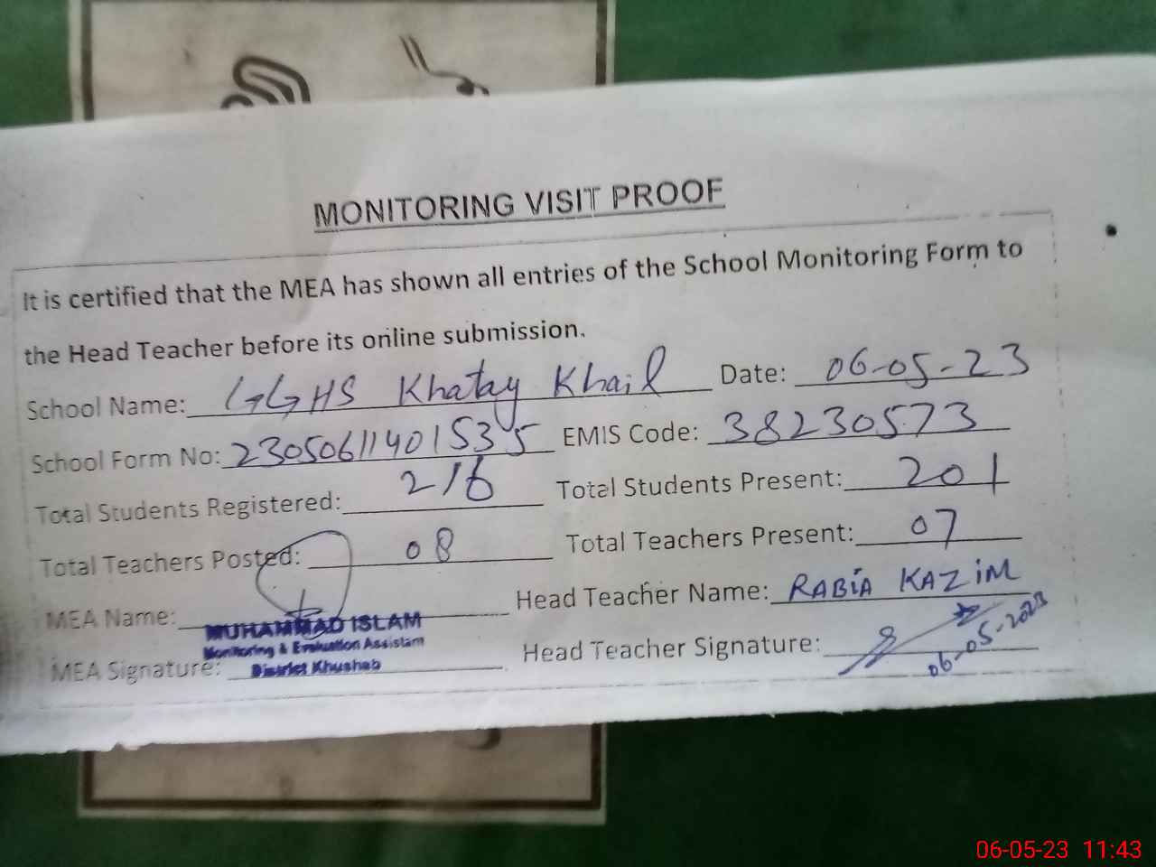 | Attendance Register | Head Teacher | MEA with School | Visit Proof |