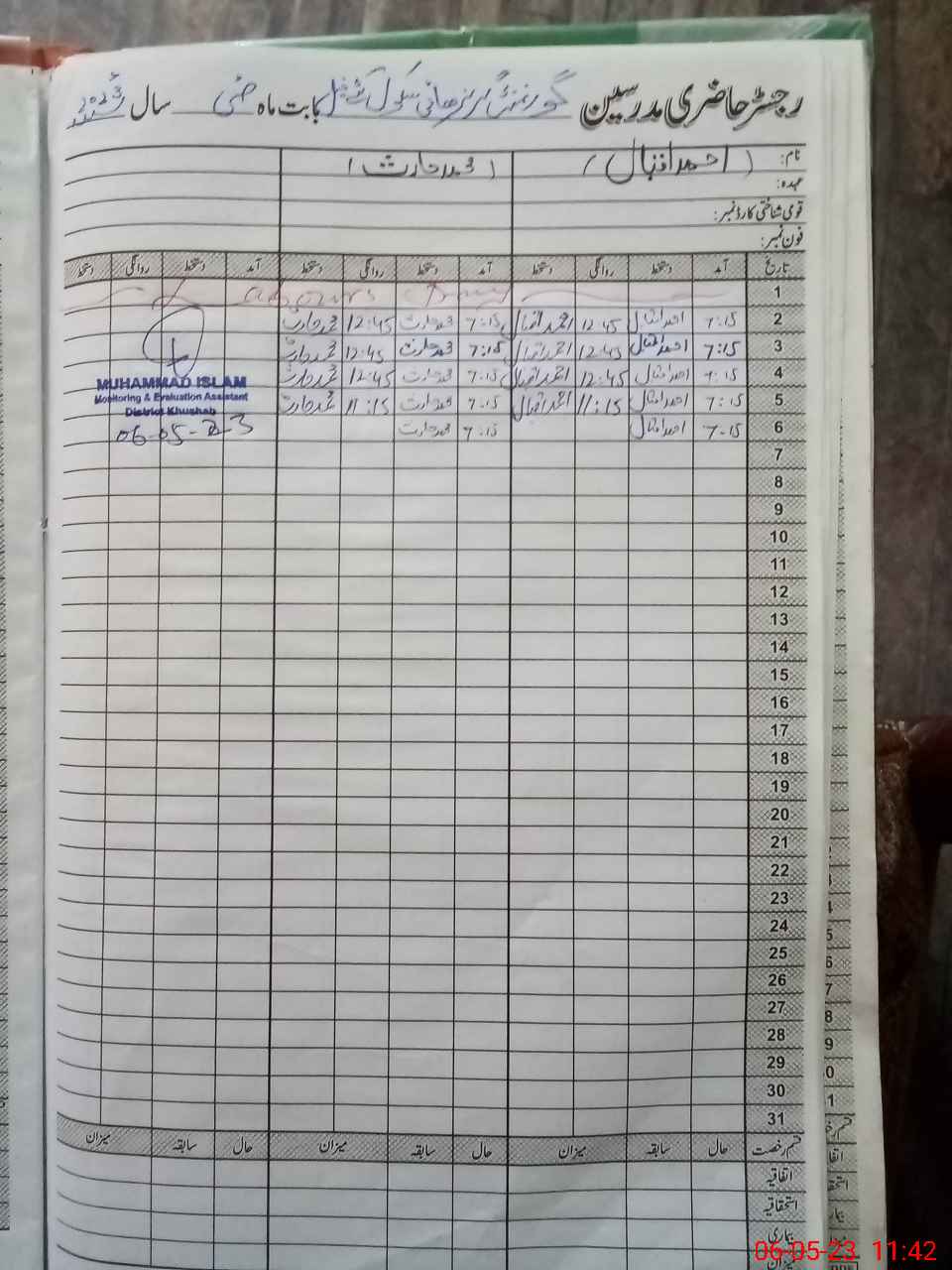 | Name: Me**** As**** Designation: (School Headmaster's/Headmistress's) Sse Urdu Phone/Cell Number: 03**** |