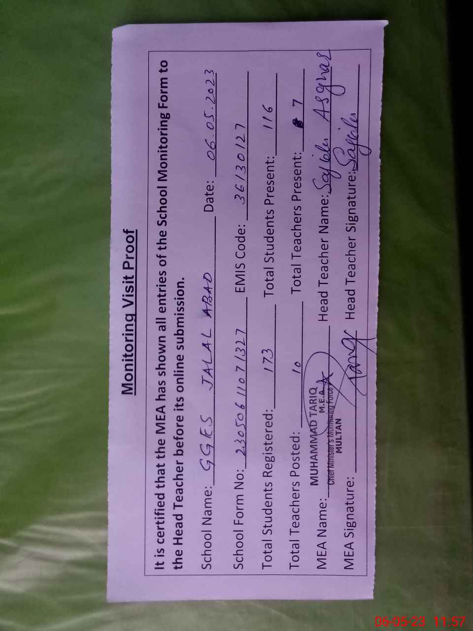 | Attendance Register | Head Teacher | MEA with School | Visit Proof |