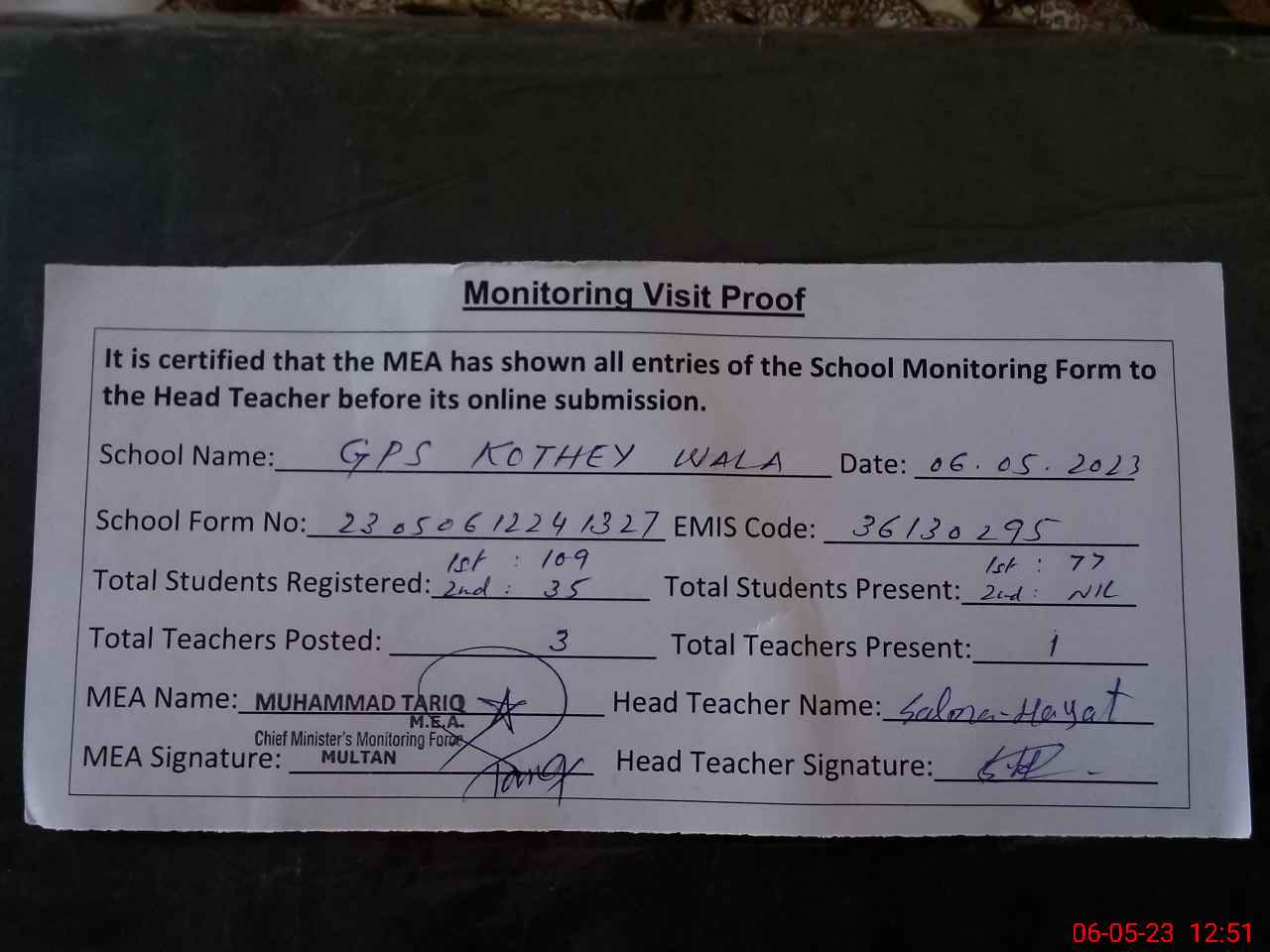 | Attendance Register | Head Teacher | MEA with School | Visit Proof |