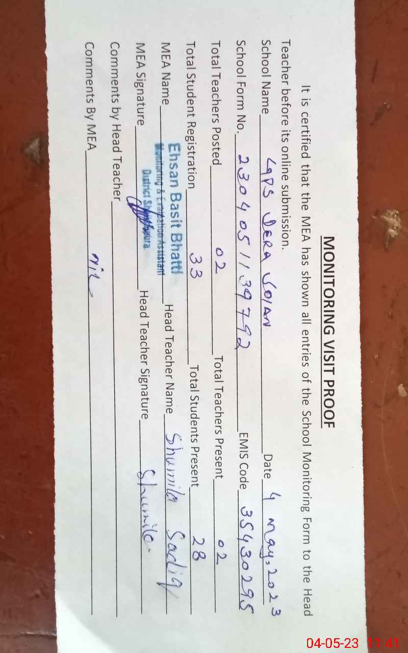 | EMIS Code: 35430295 | Name of School: GPS DERA SOIAN | |||
