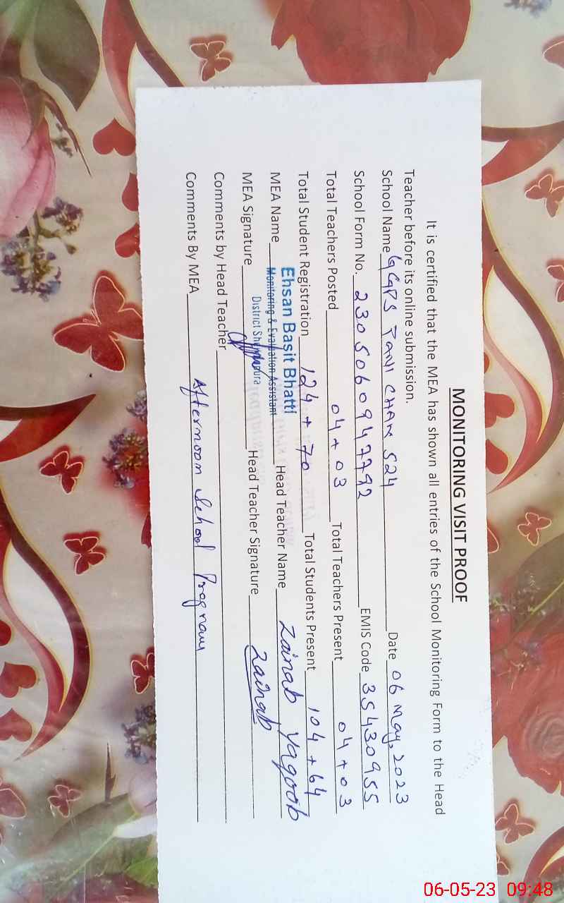 | EMIS Code: 35430955 | Name of School: GGPS TANI CHAK 524 CHACHI KOTHI | |||