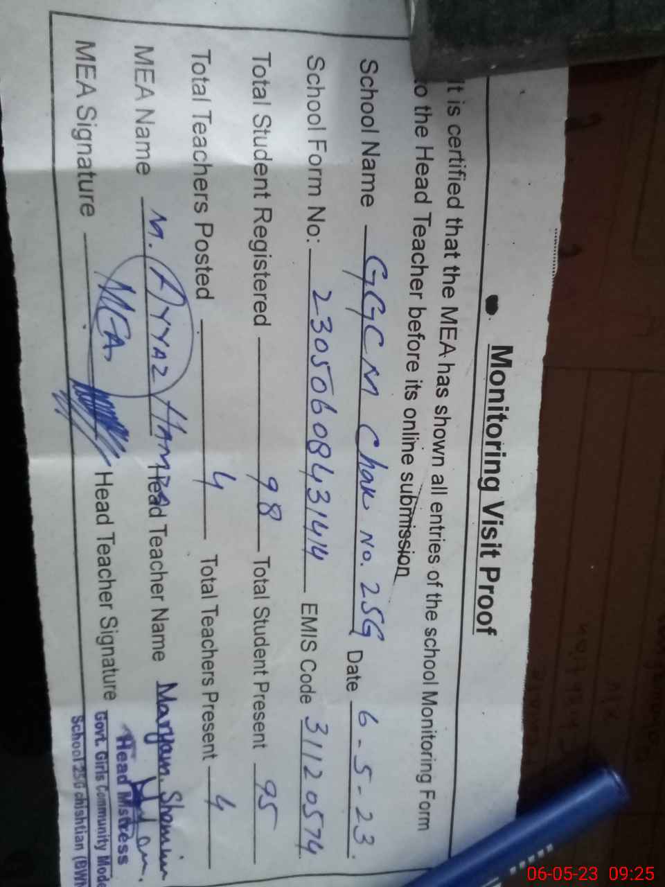 | Attendance Register | Head Teacher | MEA with School | Visit Proof |