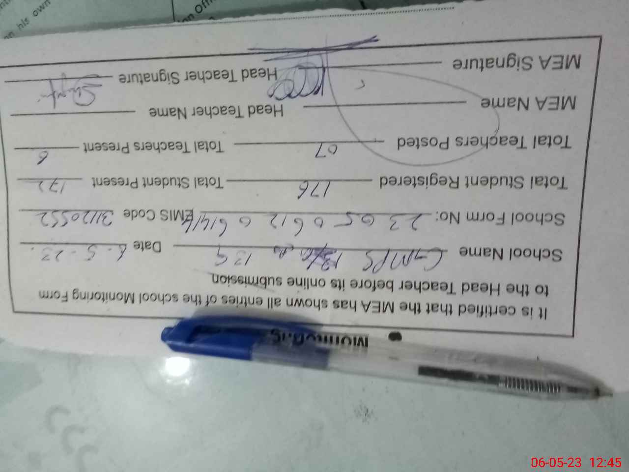 | Attendance Register | Head Teacher | MEA with School | Visit Proof |