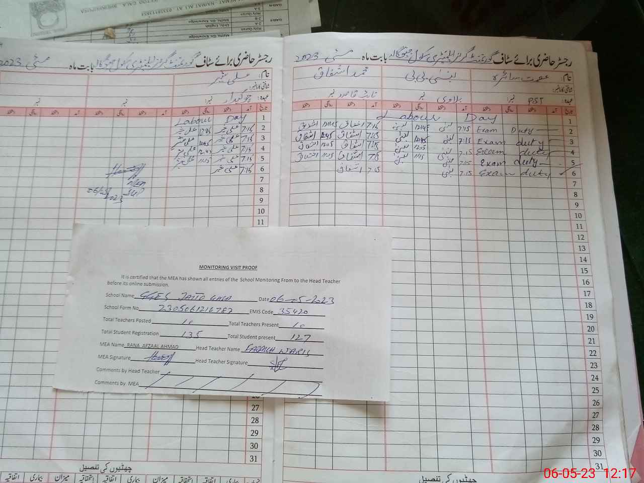 | Attendance Register | Head Teacher | MEA with School | Visit Proof |