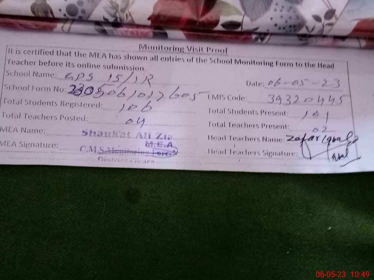 | Certified that this School was Inspected by the Undersigned MEA/DMO Today and the Information Stated Above is as Per Record. | |||||