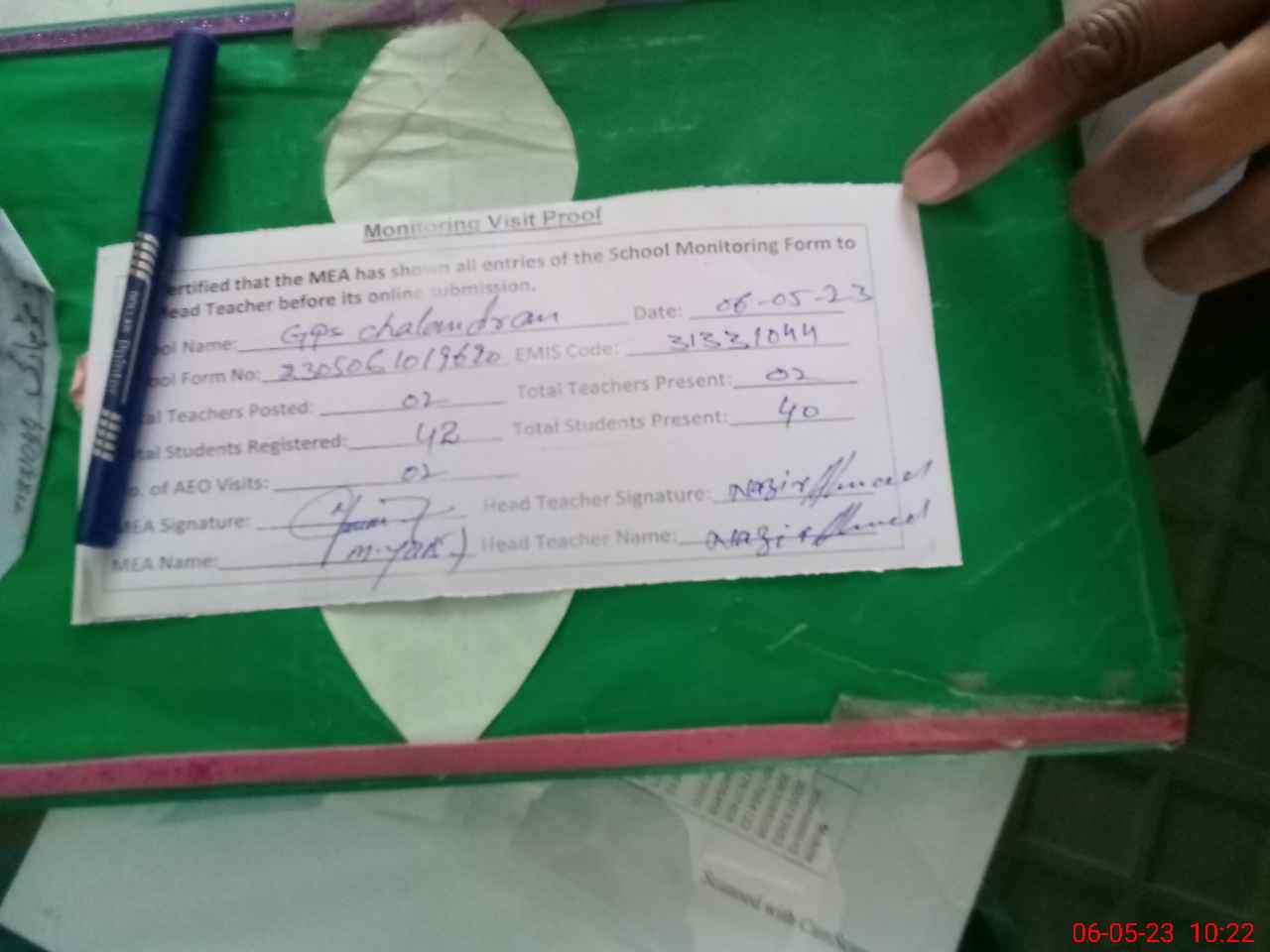 | Attendance Register | Head Teacher | MEA with School | Visit Proof |