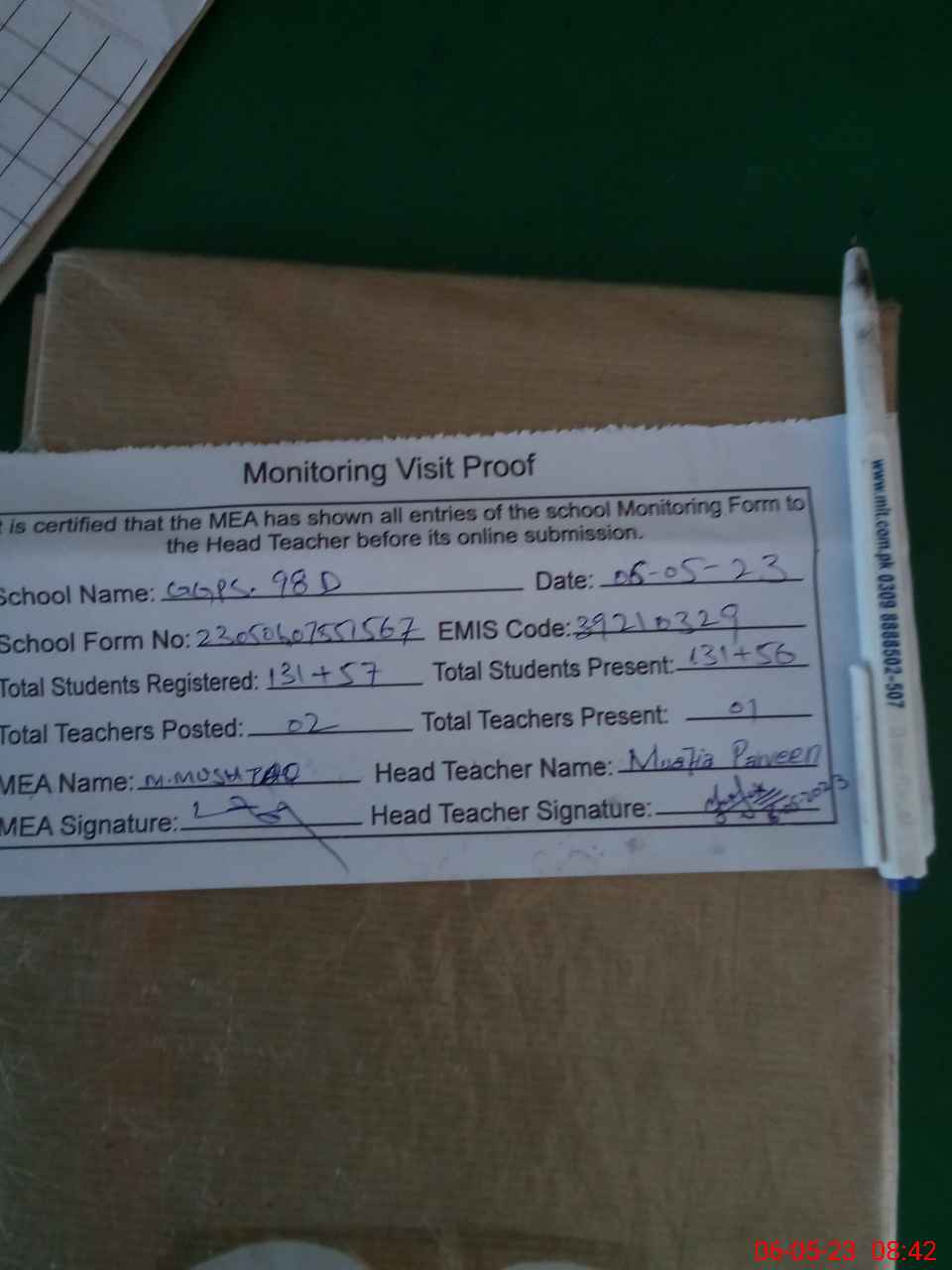 | Attendance Register | Head Teacher | MEA with School | Visit Proof |