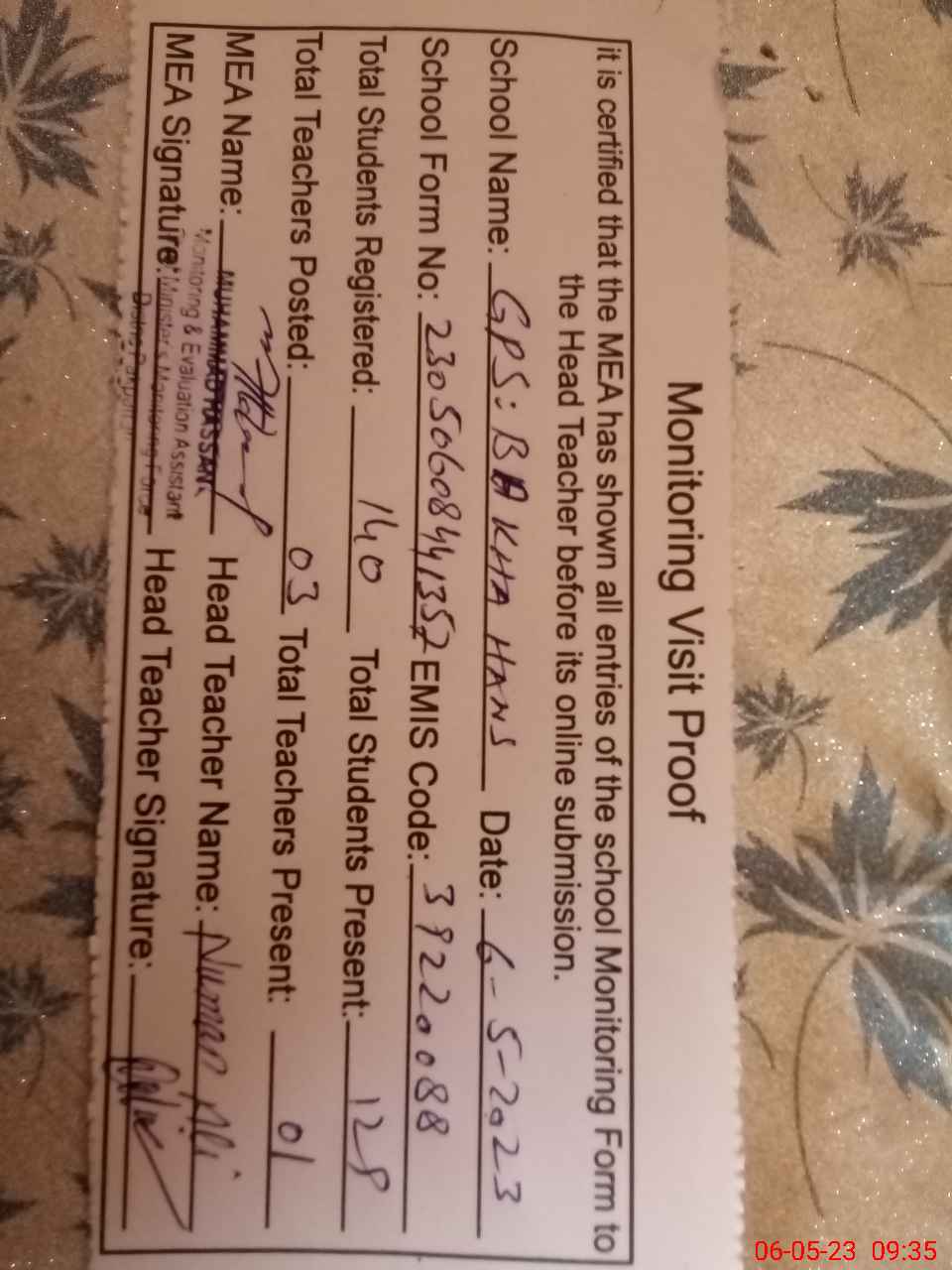 | Attendance Register | Head Teacher | MEA with School | Visit Proof |