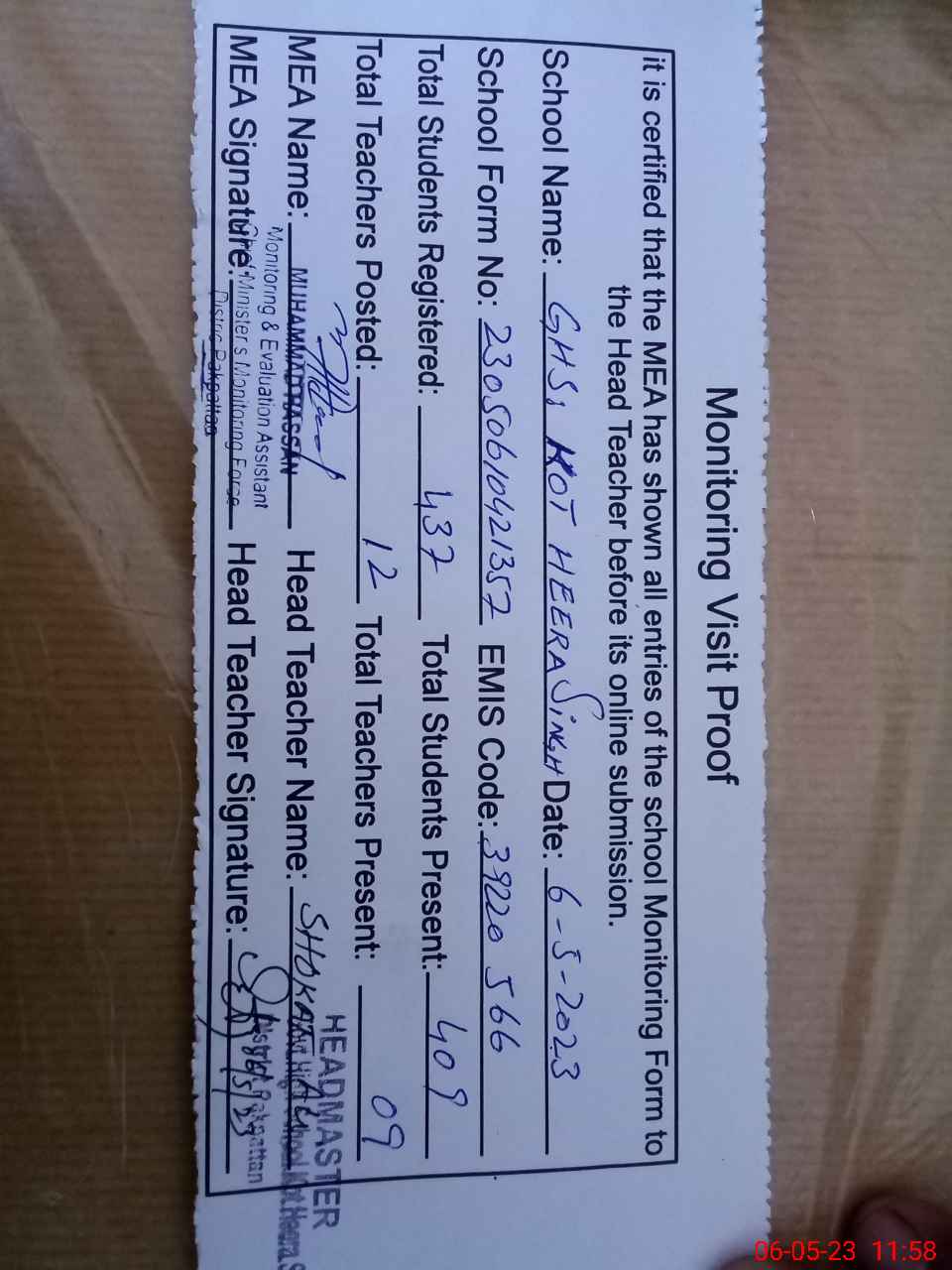| EMIS Code: 39220566 | Name of School: GHS KOT HEERASINGH P.O SAME | |||